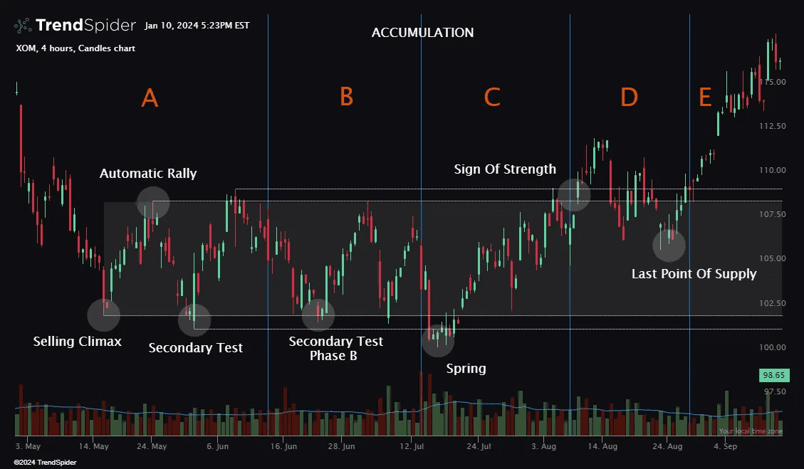 Mô hình tích lũy Wyckoff chia thành 5 giai đoạn A → E.